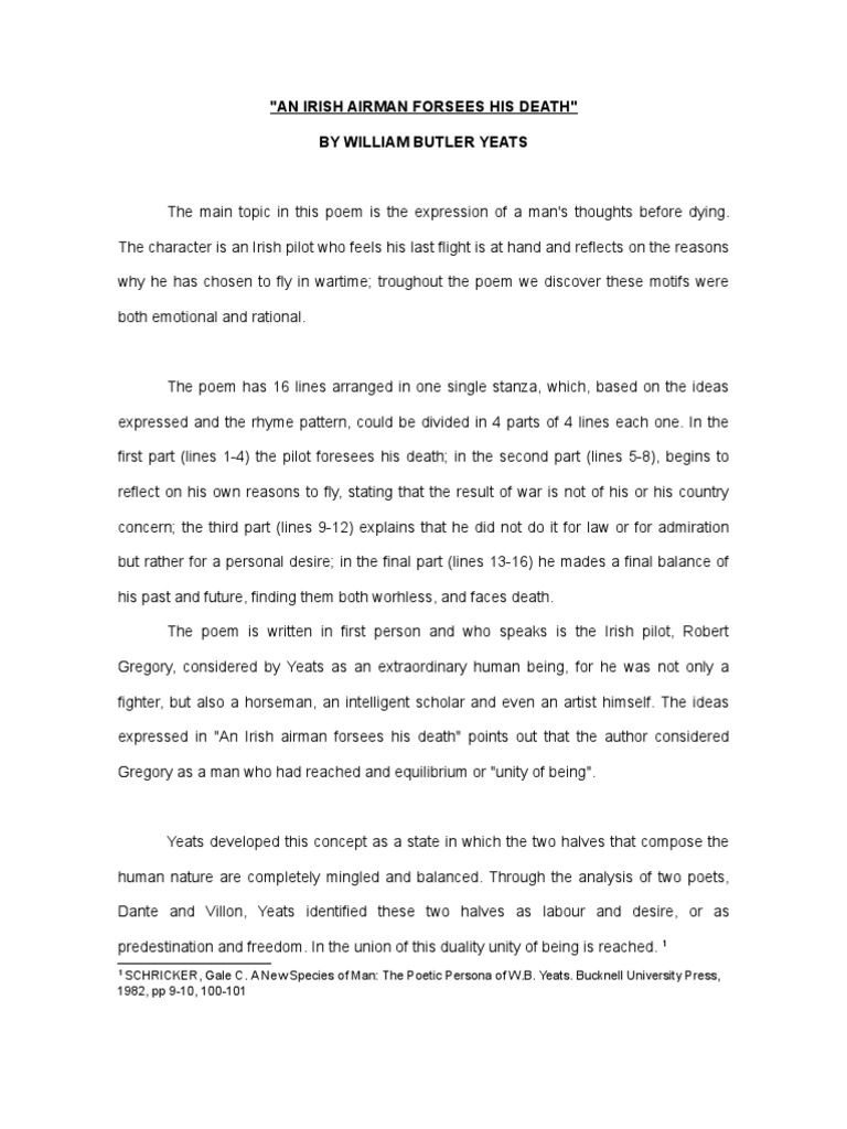 He was killed in action during wwi as he fought for the british. An irish airman foresees his death is a poem by irish poet william butler yeats, written in 1918 and first published in the macmillan edition of the wild swans at coole in 1919. In william butler yeats' poem, an irish airman foresees his death, he focuses on man's inner nature. In the opening lines of an irish airman forsees his death, the speaker allows the readers to understand that he is facing certain death. I see the irish airman as a man who acknowledges to himself and the world that he has a core which is free from whatever is around him.