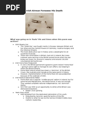 An Irish Airman Foresees His Death. The speaker, an irish airman fighting in world war i, declares that he knows he will die fighting among the clouds. Here is another of yeats' poems which i have set to music. World war 1 broke out during the struggle and despite the conflict with britain, many irishmen enlisted to fight for britain. This poem was written in 1918, near the end of world war i, and published the following year. He touches on the many jumbled thoughts that must race through one's mind at the point when they realize that their death is inevitable.